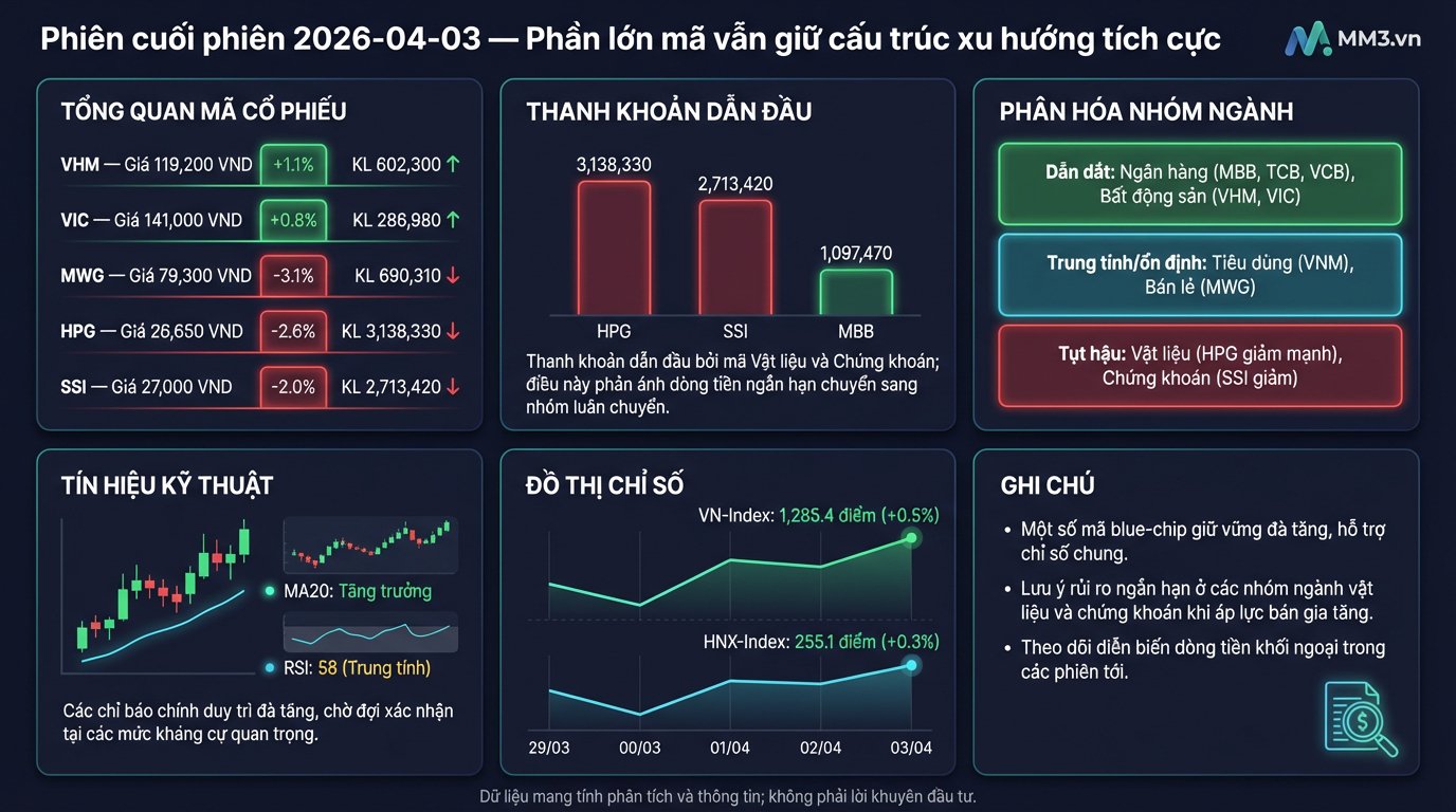 The report dated April 3, 2026, does not provide the VN-Index or HNX-Index in its data source. Therefore, the analysis focuses on the performance of each stock in the report and the accompanying technical indicators.