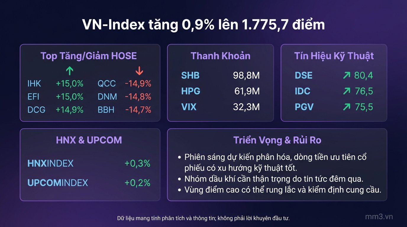 The most likely scenario for the morning session is that the market opens positively but with mixed results. Capital flows are likely to continue favoring stocks with strong technical trends, stable liquidity, and high composite scores, while stocks affected by specific news will be scrutinized more closely at the start of the session.
