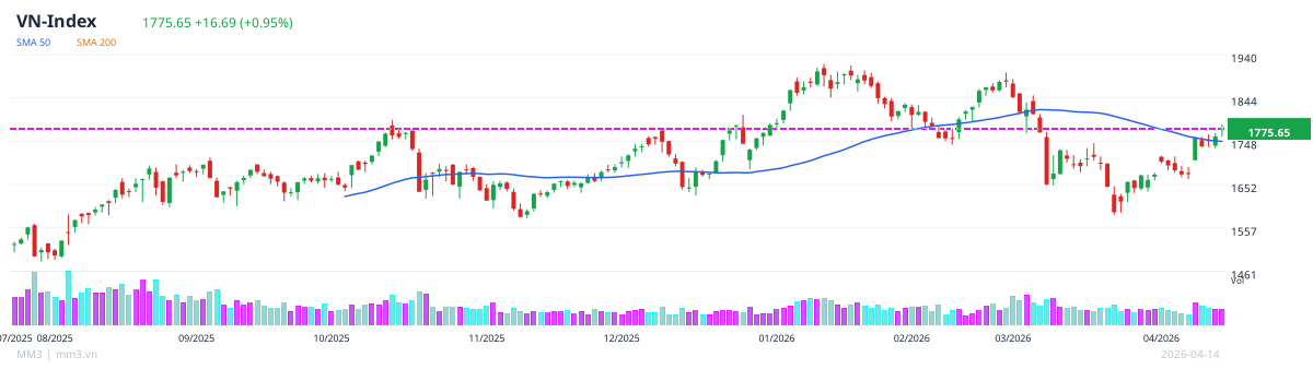 VNINDEX 1,775.7 +0.9% Approaching the 1,775-1,780 resistance zone.
