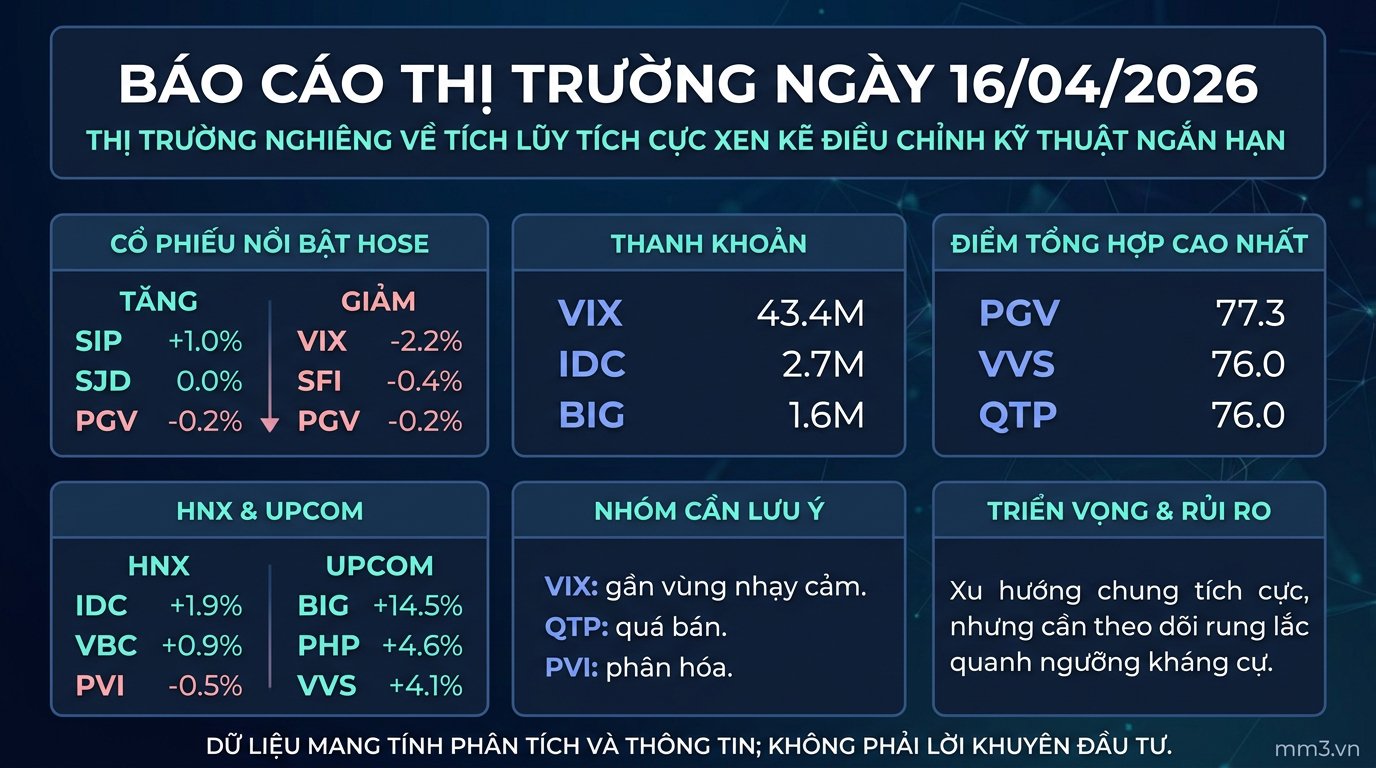 The closing session on April 16, 2026, showed that the technical outlook for many stocks remained positive, with MACD , EMA , and PSAR signals generally indicating an upward trend. Capital continued to favor stocks with strong momentum, while some stocks showed signs of divergence or stalled around short-term resistance levels.