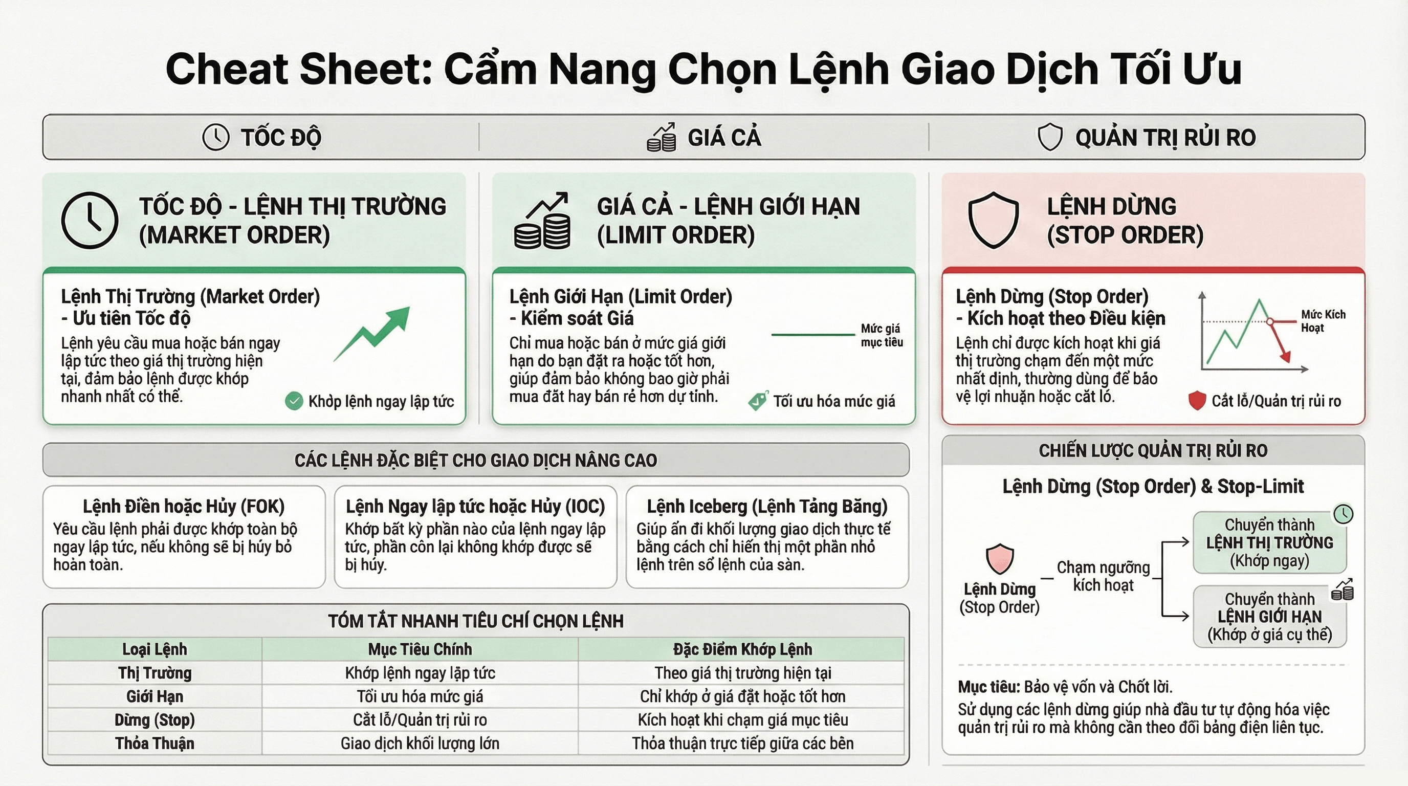 Choosing the right order type helps control risk and optimize execution price: limit orders help avoid buying at high prices; stop orders protect against sharp declines; OCO orders are convenient for strategies with profit targets and automatic stop-loss orders. Short-term investors need to combine limit and stop orders to manage risk in volatile conditions.