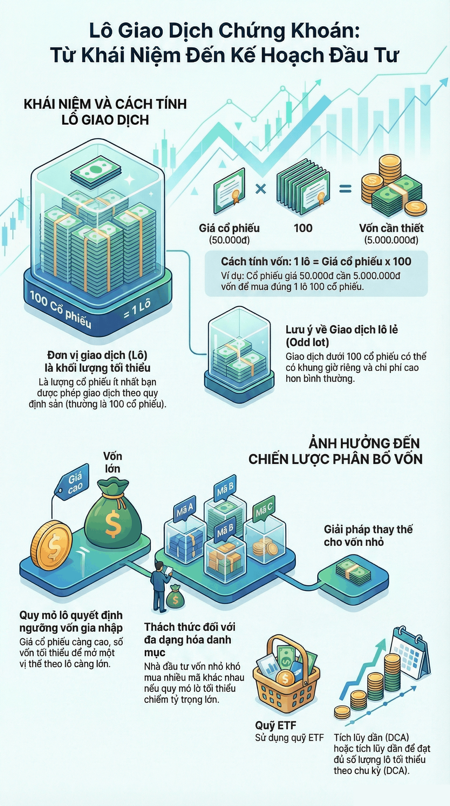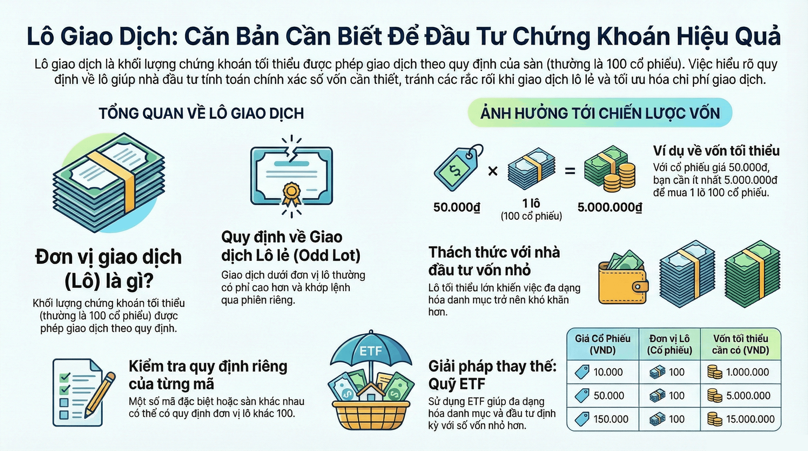 For example: If the price of XYZ stock is 50,000 VND/share, a lot of 100 shares requires 5,000,000 VND in capital (excluding fees).