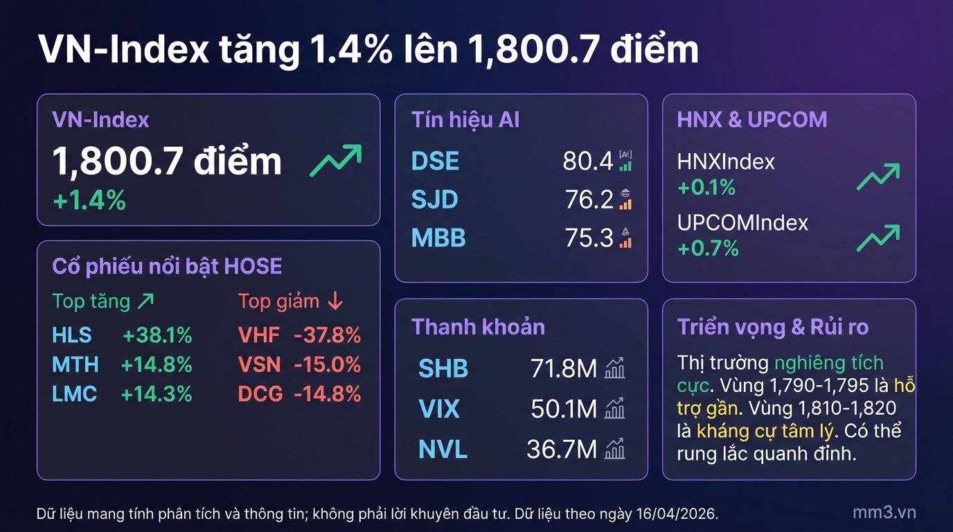 | VNINDEX | 1,800.7 | +25.0 (+1.4%) | 805.5 million |