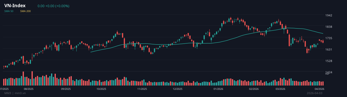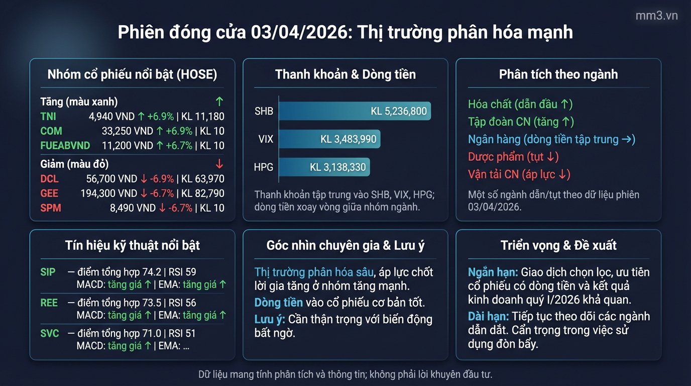 The closing session on April 3, 2026, witnessed a highly divergent market. Data for the VN-Index and HNX-Index was unavailable; however, this session showed a rotation of capital flows among different stocks and sectors. Liquidity was concentrated in a few large-cap stocks, reflecting the market's selectivity.