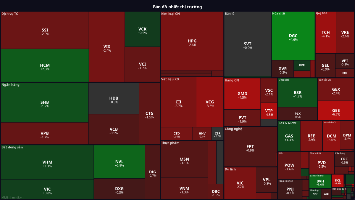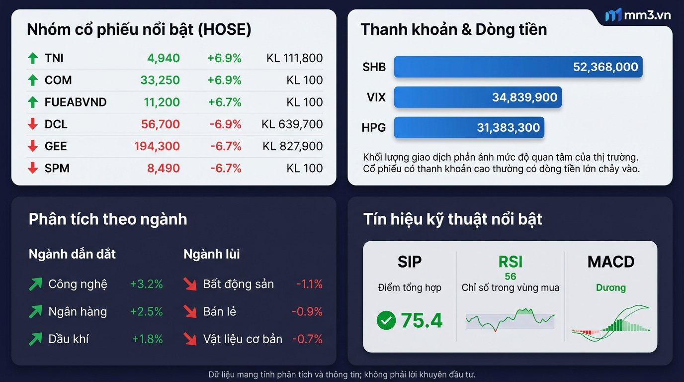 Looking at the sectors, some leading sectors include Chemicals (e.g., DGC +4.6%), Industrial Group (e.g., TNI +6.9%), and Real Estate (e.g., NVL +2.9%). Meanwhile, Pharmaceuticals ( DCL -6.9%), Industrial Transportation ( GEE -6.7%), and Retail ( MWG -3.1%) are under pressure.