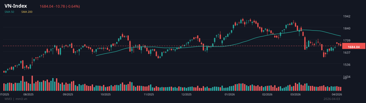 On the morning of April 6, 2026, the VN-Index stood at 1,684.04 points, down 0.6% from the reference point. Trading volume on the main exchange reached approximately 696,862,532 units, and the market showed divergence with a significant number of declining stocks. The trading session focused on short-term rotations rather than a consensus trend.