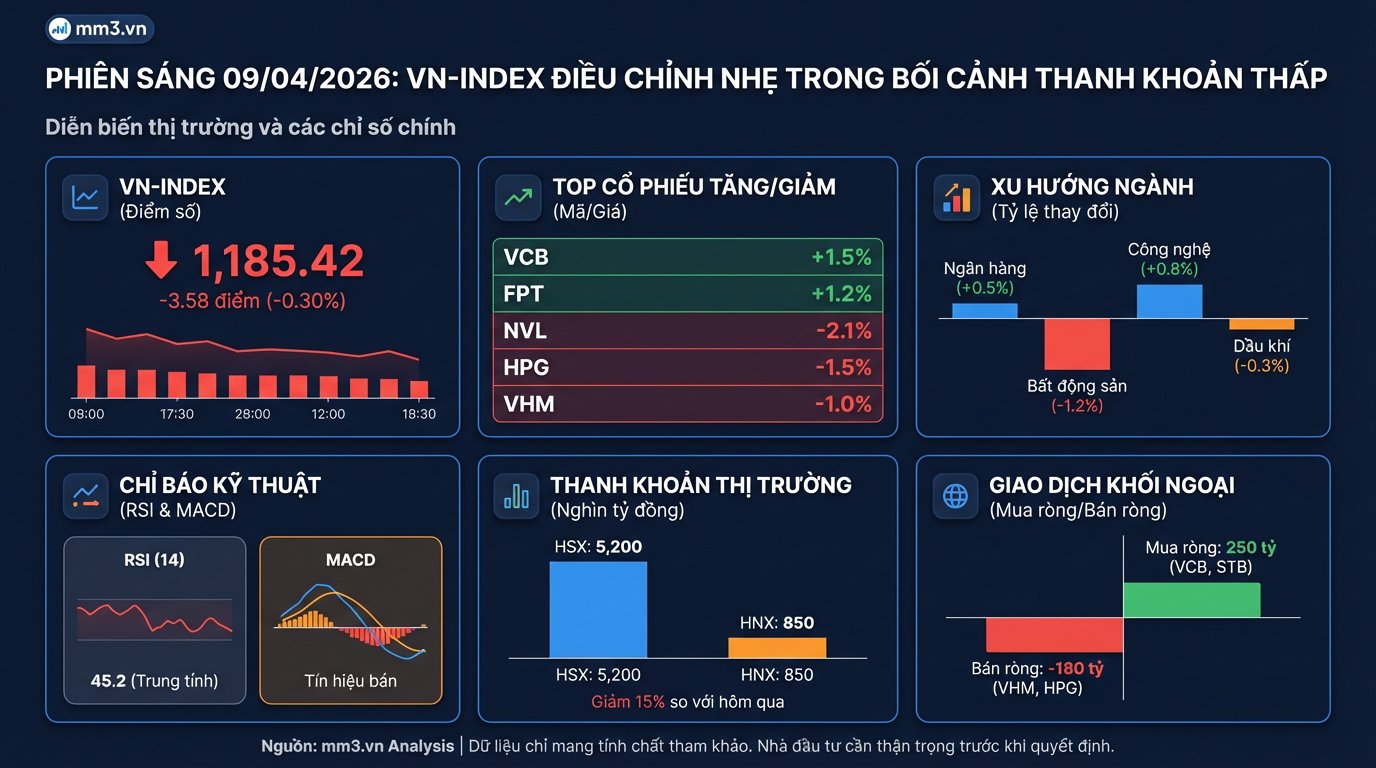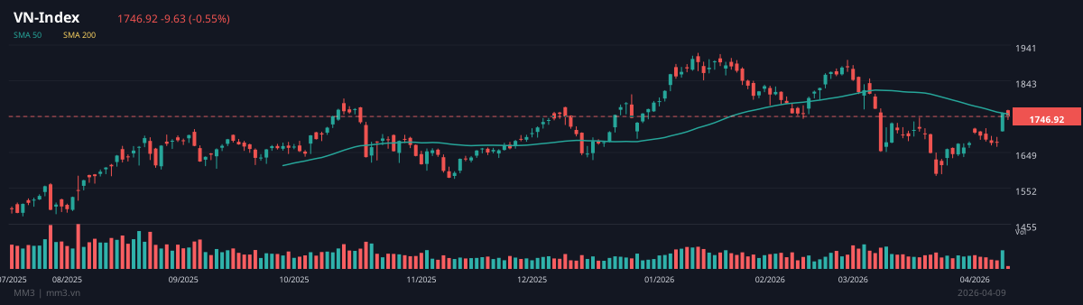 On the morning of April 9, 2026, the Vietnamese stock market experienced a slight correction across all three exchanges. The VNINDEX fell 0.6% to 1,746.9 points with a trading volume of 169.8 million shares. The HNXINDEX decreased 0.7% to 251.5 points, while the UPCOMINDEX lost 0.3% to 127.3 points. Market breadth was generally mixed, indicating that while capital has not yet withdrawn, it is clearly selective among different stock groups.