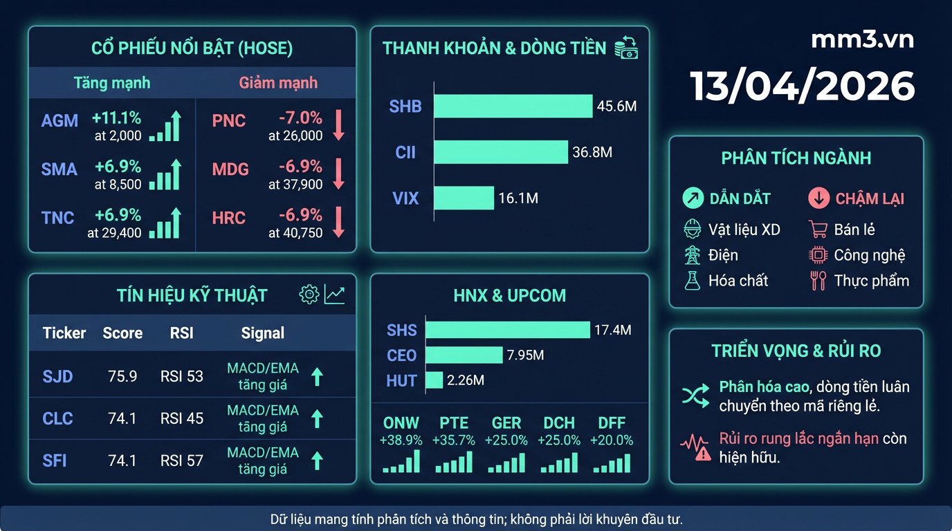 Midday trading on April 13, 2026, saw a clear divergence in the Vietnamese market. The VNINDEX fell 0.46% to 1,741.94 points with a trading volume of 430.5 million shares, indicating that supply was still present but had not yet created a widespread selling pressure across the entire market.