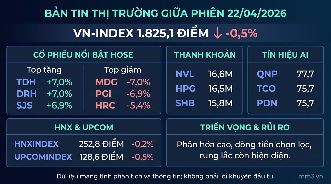 Midway through the trading session on April 22, 2026, the Vietnamese stock market continued to lean towards a slight correction, but there was no widespread selling pressure. The VN-Index closed at 1,825.1 points, down 0.5%, while the HNX-Index was at 252.8 points, down 0.2%, and the UPCOM-Index was at 128.6 points, down 0.5%.