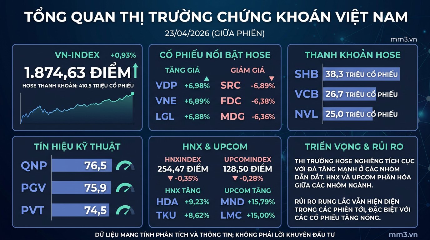 The Vietnamese stock market showed mixed performance, but the overall trend remained positive during the midday trading session on April 23, 2026. The VNINDEX rose 17.3 points, or 0.9%, to 1,874.6 points, reflecting continued buying pressure on leading stocks. Total trading volume on the HOSE reached 410.5 million shares, indicating that capital flows remained high despite uneven increases.