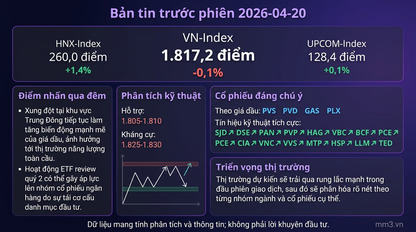 Based on data up to 2026-04-18T06:07:51Z , the VN-Index is still fluctuating around its equilibrium zone after a slight correction. Near-term support to watch is at 1,805-1,810 points, while short-term resistance is in the 1,825-1,830 point range.