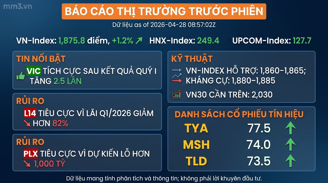 The Vietnamese stock market entered the April 29th session on positive terms after the strong gains of the previous session, amidst continued divergence in capital flows based on corporate news. Data up to April 28th, 2026 shows the VN-Index at 1,875.8 points, up 1.2% , thus maintaining the short-term recovery trend.