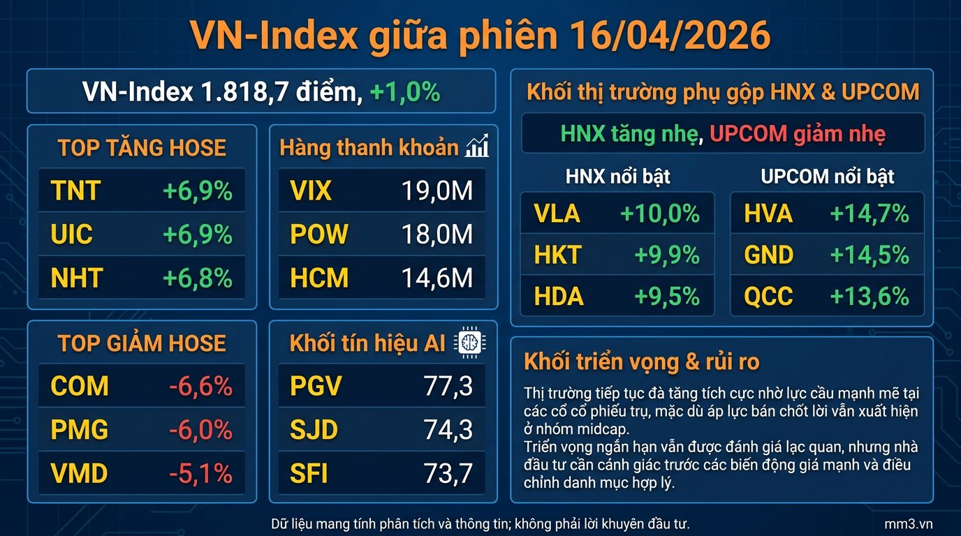 Mid-session on April 16, 2026 , the Vietnamese stock market remained mixed but leaned towards positive on the HOSE. The VN-Index rose to 1,818.7 points, equivalent to +1.0% , while the HNX-Index edged up slightly to 252.9 points and the UPCOM-Index fell 0.6% to 128.1 points.