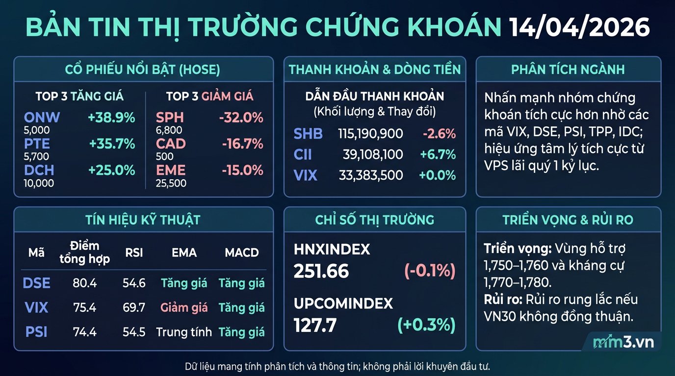 The trading session on April 14, 2026 is likely to open in a mixed state, with the VNINDEX maintaining its upward momentum while the VN30 and HNX30 show signs of slowing down. This indicates that the distribution of capital is not yet truly uniform, despite some positive external signals.