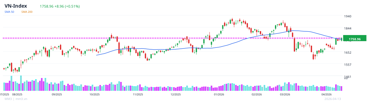 Outlook for the April 14th session : The VNINDEX is likely to continue testing the 1,750–1,760 support zone before heading towards 1,770–1,780 if capital flows improve. Further developments to watch include the reaction of the securities sector to VPS 's earnings results, as well as the consensus of the VN30 at the 1,920–1,930 range.